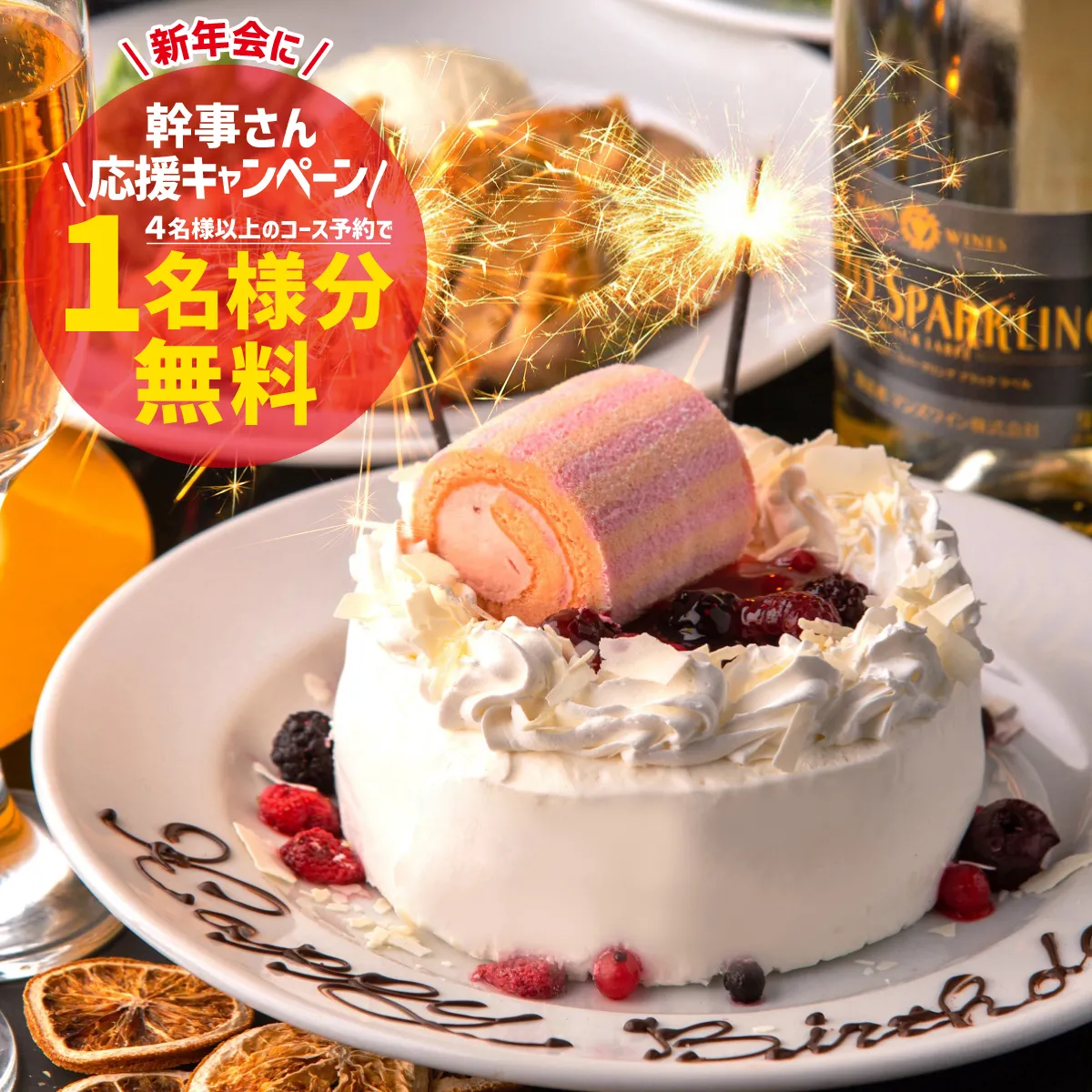 アニバーサリーにふさわしい豪華ホールケーキとシェフ渾身の絶品メニューが楽しめる特別プラン!3時間の飲み放題も付いて⇒3850円♪ホールケーキにはお名前やメッセージを無料でお書き致しますのでお気軽にご相談下さい!誕生日会・記念日・歓送迎会など様々なシーンに対応♪