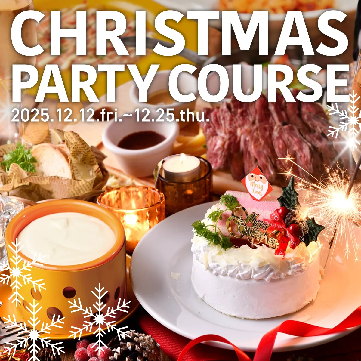 聖なる夜に豪華メニューが彩るクリスマスディナーはいかがでしょうか?心温まるとろ~り濃厚チーズフォンデュや肉汁溢れるジューシーな牛ハラミのグリルなど豪華なラインナップに加え、クリスマス限定の特製ホールケーキまで付いた「クリスマスパーティーコース」をご用意いたしました!クリスマス女子会やデート・パーティーなど様々なシーンでぜひご利用ください。