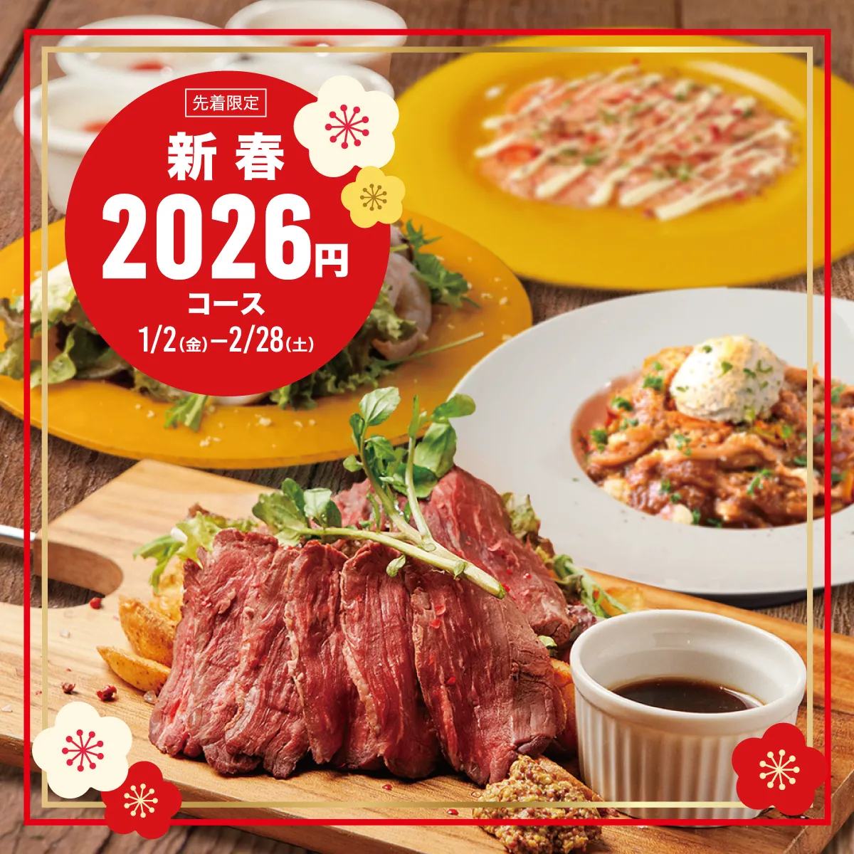 新しい年のスタートにぴったり!毎年大好評の【新春★2026円コース】が新年とともに登場!メインは、贅沢なトリュフ香るグリルステーキ。前菜からデザートまで楽しめる全5品に2時間の飲み放題も付いて驚愕の⇒ 「“2026円”」!日頃のご愛顧に感謝を込めた、新春限定の特別価格となっております!先着3組様限定につき、ご予約はお早めに!!!