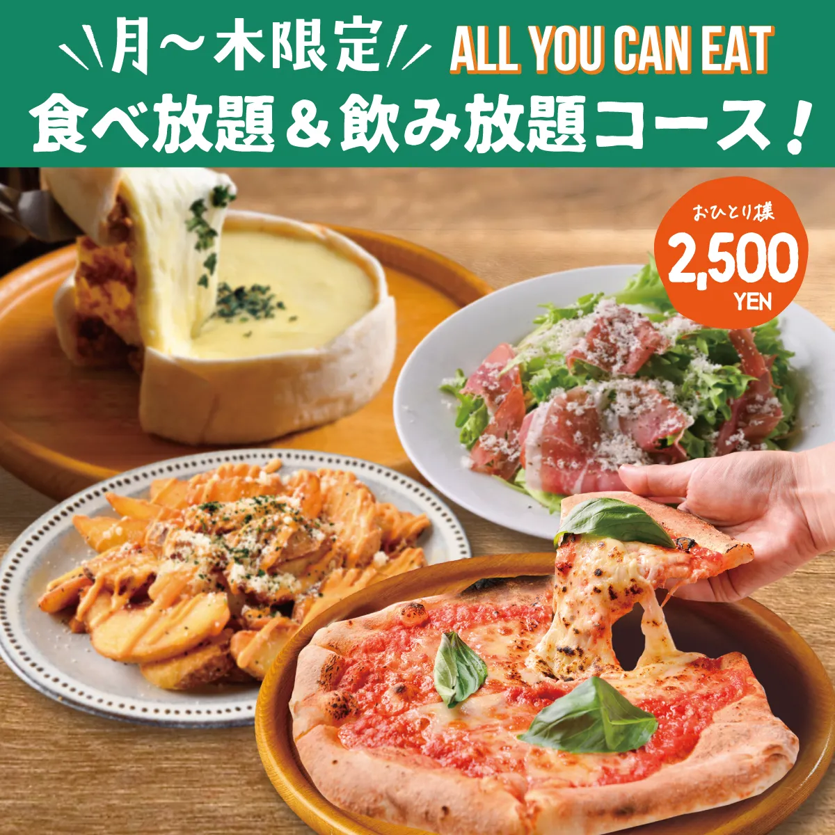 とにかく安くてお得な高コスパプランが新登場!マルゲリータやクワトロフォルマッジ、明太マヨベーコンピザなど絶品ピッツァが食べ放題!さらに、サラダ、ポテトフライ、デザートなど“欲しい”が揃った全4品に2時間の飲み放題も付いて2500円と超得価格!今なら+500円で3種のオリジナルシカゴピザも食べ放題OK!
