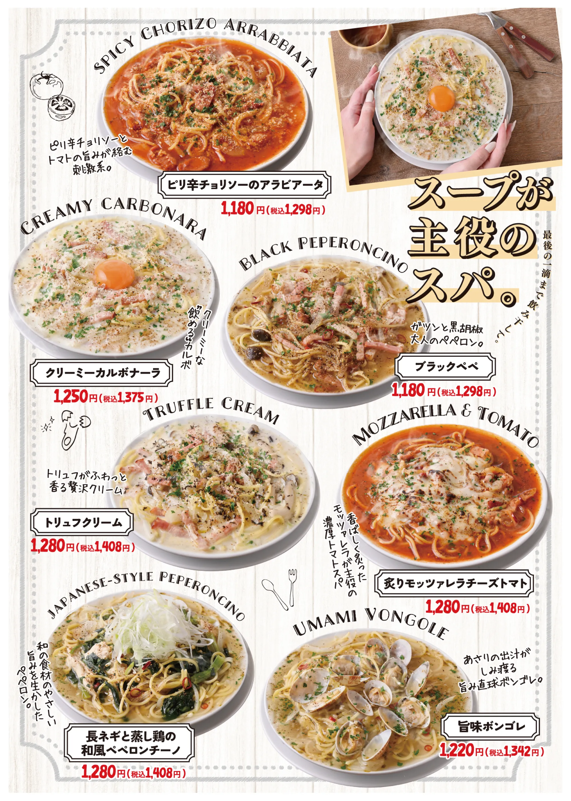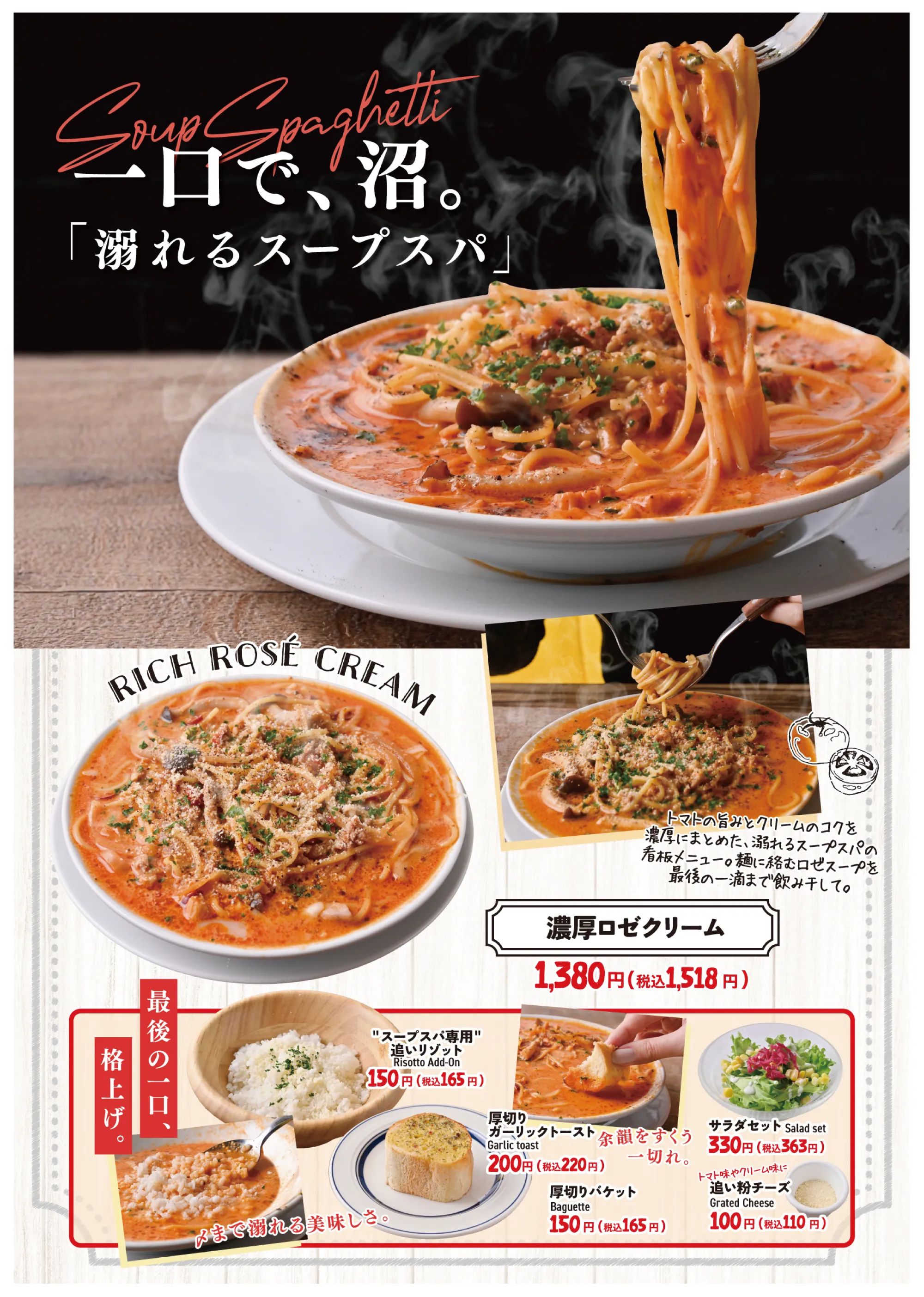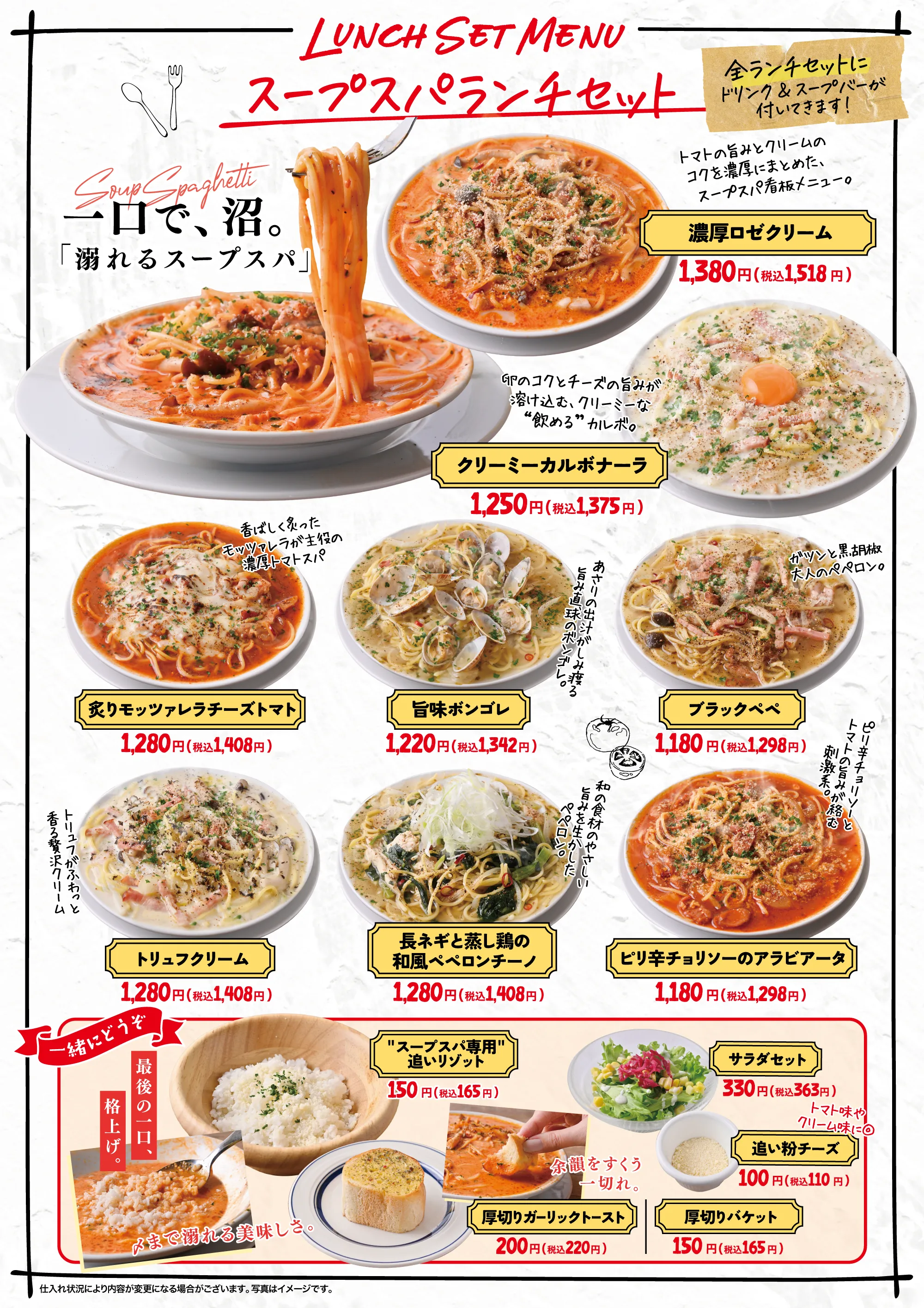 スープに浸って、ピッツァで満たす。 今話題の中毒系「溺れるスープスパ8種」と、王道の美味しさが人気の「定番ピッツァ5種」を気軽に楽しめる食べ放題プラン。さらに、スープスパと相性抜群の「バゲット」、気軽につまめる「チェダーチーズポテトフライ」も食べ放題でご用意しております。