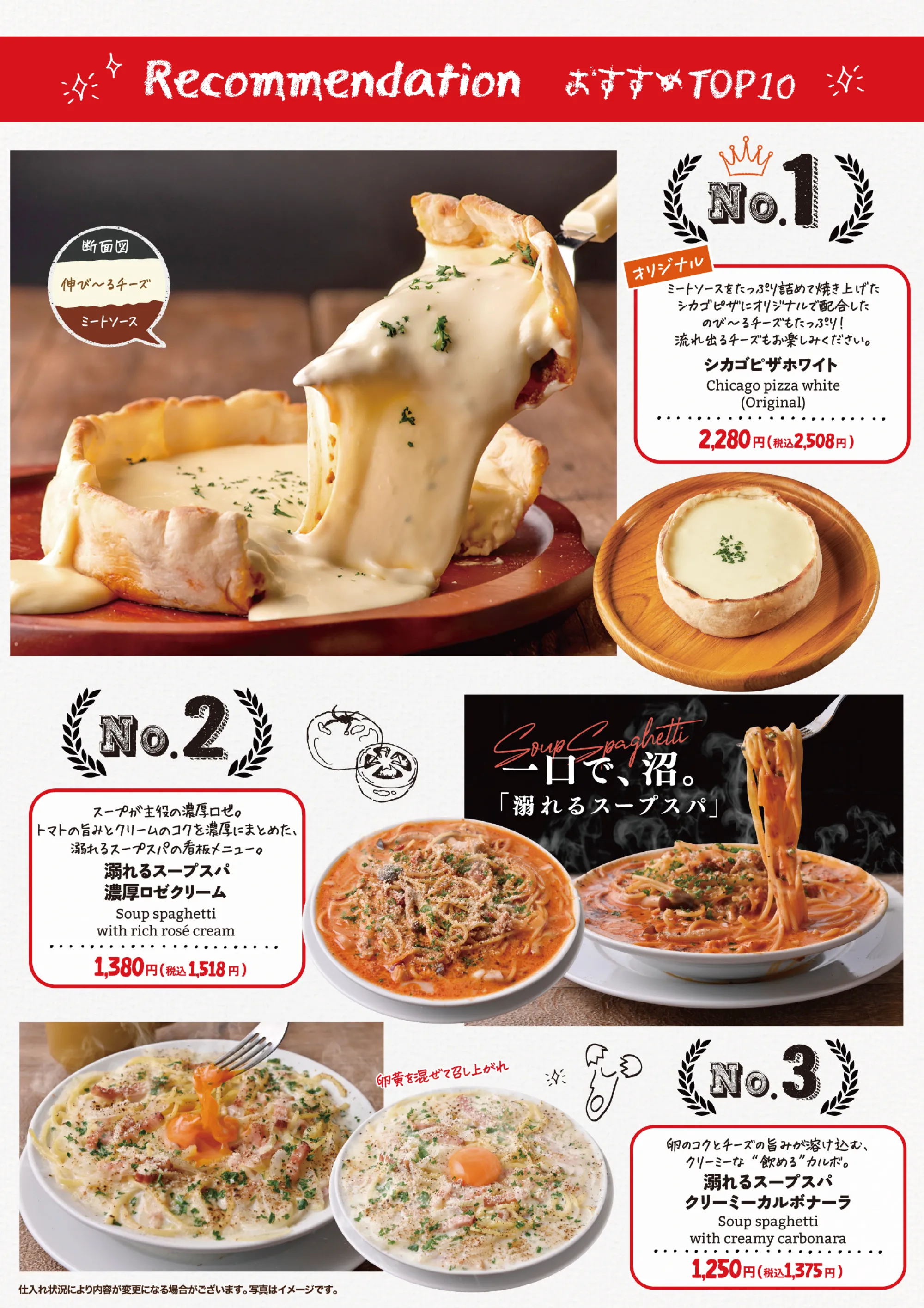 チーズと旨みの海に溺れる。 今話題の中毒系「溺れるスープスパ8種」に、溢れ出す濃厚チーズが自慢の「シカゴピザ3種」、さらに王道の美味しさが人気の「定番ピッツァ5種」がすべて食べ放題で楽しめる贅沢プラン!さらに、スープスパと相性抜群の「バゲット」、気軽につまめる「チェダーチーズポテトフライ」も食べ放題でご用意しております。気分に合わせて楽しめる幅広いラインナップはお腹いっぱい、大満足間違いなし!
