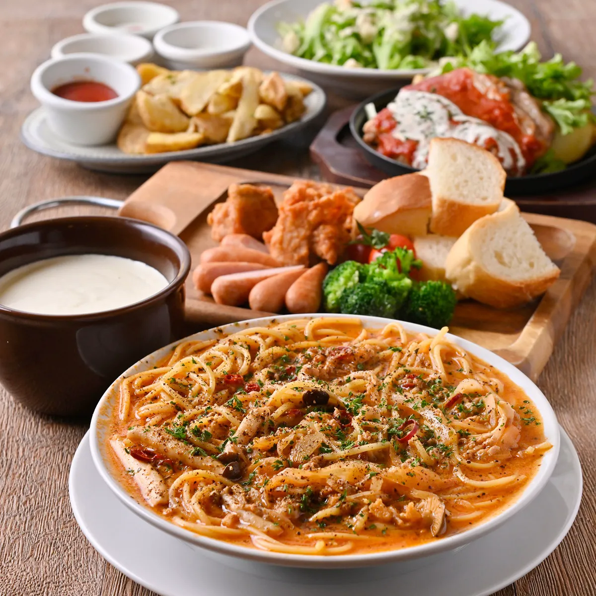 シェフこだわりの絶品イタリアンに加え、大人気の「シカゴピザ」と特製ピッツアが食べ放題に!さらにメインには、『”溺れる”スープスパ』の人気看板メニュー「濃厚ロゼクリーム」をご用意!普段とはひと味違う、ワンランク上の食べ放題を楽しみたい方におすすめです。