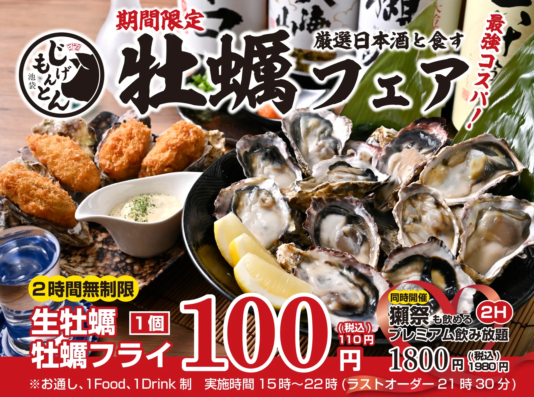 新鮮でぷりぷりな海のミルク「生牡蠣」と、外はサクサク中はとろける旨みたっぷりの「牡蠣フライ」が1個100円で楽しめる『牡蠣フェア』開催中!なんと個数制限なしの超破格値◎さらに、牡蠣と相性抜群の厳選日本酒を全6種ご用意しました。+1,980円で「厳選日本酒付き飲み放題」も追加OK!「牡蠣×日本酒」の旨みがふくらむ極上ペアリングをご堪能ください。