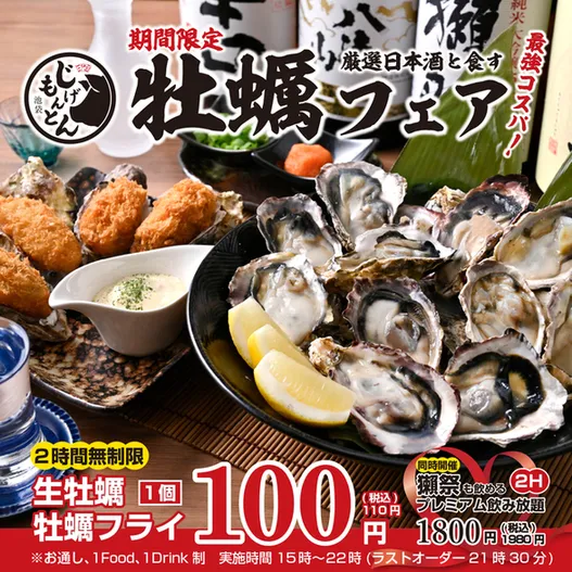 新鮮でぷりぷりな海のミルク「生牡蠣」と、外はサクサク中はとろける旨みたっぷりの「牡蠣フライ」が1個100円で楽しめる『牡蠣フェア』開催中!なんと個数制限なしの超破格値◎さらに、牡蠣と相性抜群の厳選日本酒をご用意しました。+1,980円で「厳選日本酒付き飲み放題」も追加OK!「牡蠣×日本酒」の旨みがふくらむ極上ペアリングをご堪能ください。