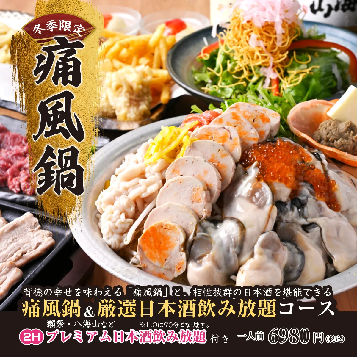 冬のごちそうを一鍋に!贅沢極まる“痛風鍋”をメインに、馬刺しや鉄板焼き、鳥天&ポテトフライなど豪華メニューが勢ぞろい。〆のちゃんぽん&デザート、さらには痛風鍋との相性抜群な厳選日本酒を含む豪華飲み放題付きで、寒い夜にぴったりの贅沢体験。