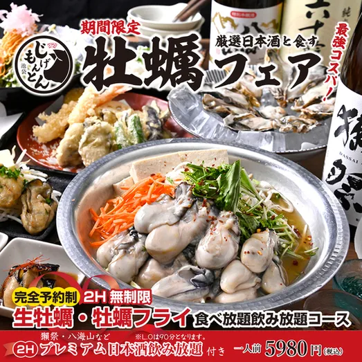 生・揚げ・焼き・鍋まで!牡蠣メニューが勢ぞろい! プリップリ鮮度抜群の「生牡蠣」と、濃厚な旨みをサクッと閉じ込めた「牡蠣フライ」がWで食べ放題。さらに、鉄板焼きや天ぷら、しぐれ煮など多彩な牡蠣料理に、旨みたっぷりの「牡蠣鍋」まで楽しめる牡蠣尽くしコースが新登場!今だけ、牡蠣との相性抜群な厳選日本酒付きプレミアム飲み放題もセットで満足度◎