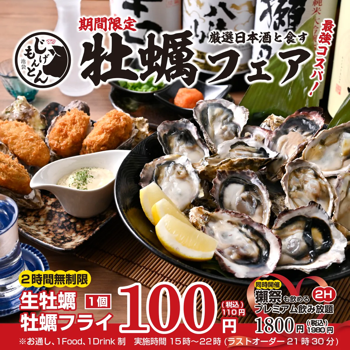 新鮮でぷりぷりな海のミルク「生牡蠣」と、外はサクサク中はとろける旨みたっぷりの「牡蠣フライ」が1個100円で楽しめる『牡蠣フェア』開催中!なんと個数制限なしの超破格値◎さらに、牡蠣と相性抜群の厳選日本酒を全6種ご用意しました。+1,980円で「厳選日本酒付き飲み放題」も追加OK!「牡蠣×日本酒」の旨みがふくらむ極上ペアリングをご堪能ください。