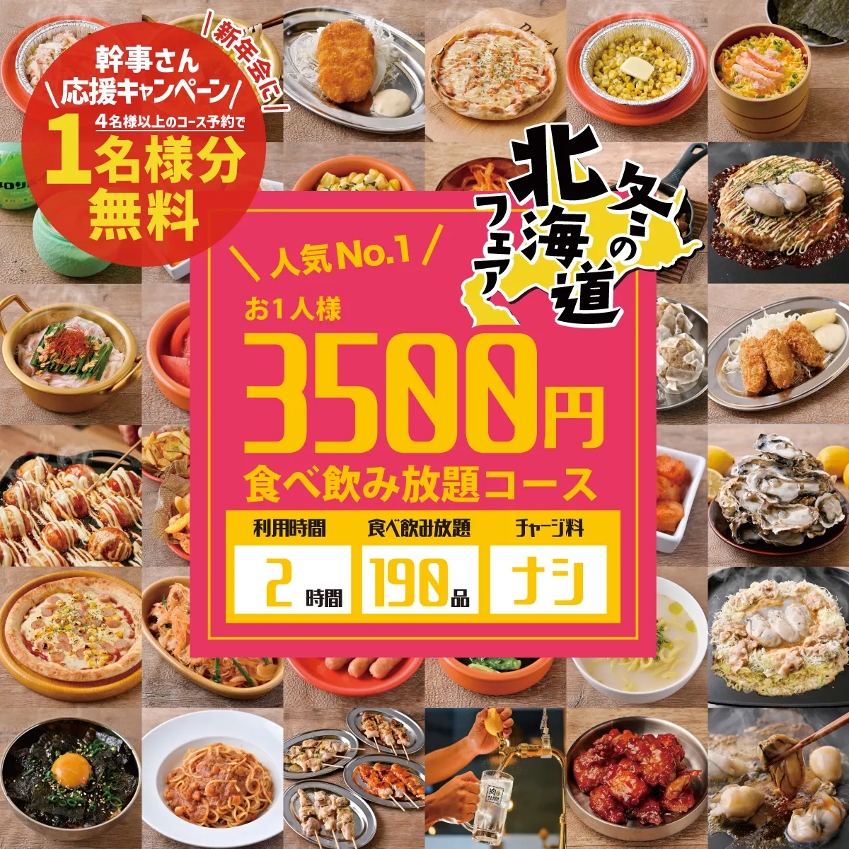 \北海道&牡蠣フェア開催/【2時間】190品食べ放題×飲み放題プラン3500円(税込3850円)
