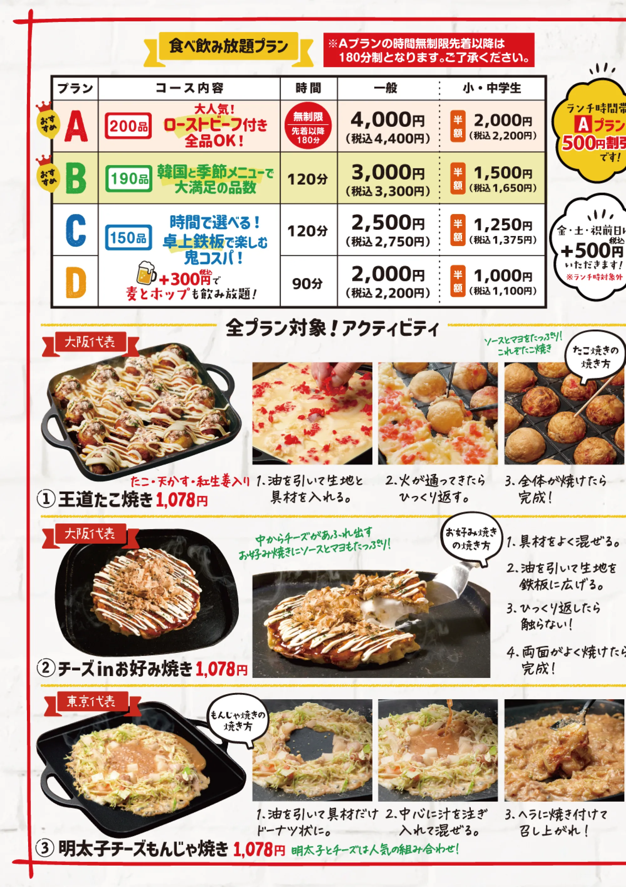 【全卓にサワータワー完備】卓上鉄板で作って楽しめる、たこ焼き・もんじゃ・お好み焼きが大人気!さらに定番おつまみ、サラダ、揚げ物、パスタ、デザート、豪華ドリンクメニューまでぜーんぶ食べ放題×飲み放題!なんと衝撃価格⇒2,000円!「安い!美味しい!お腹いっぱい!」を満たす鬼コスパプランです。