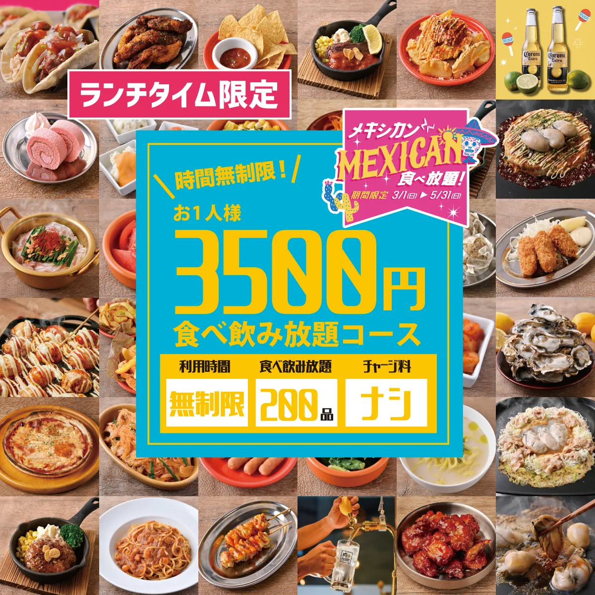 【全卓にサワータワー完備】時間を気にせず楽しめる”時間無制限”プランが登場!自分好みに包む“無限タコス”で乾杯!スパイス&ハーブが弾ける本格メキシコ料理がすべて食べ放題になる『メキシカン食べ放題フェア』で陽気なメキシカンパーティーのはじまりです!今だけ、「生・焼き・フライ」旬の絶品牡蠣メニューも◎さらにピッツァ、パスタ、デザートまで全品食べ放題×飲み放題!