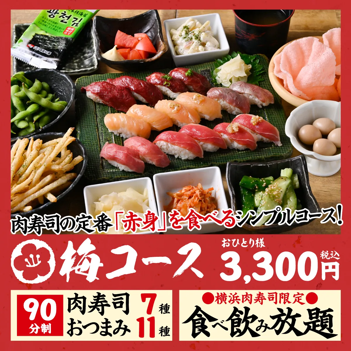 ★日~木限定★【梅コース】名物肉寿司7種+おつまみ11種食べ飲み放題★定番赤身で味わう王道肉寿司!90分3300円