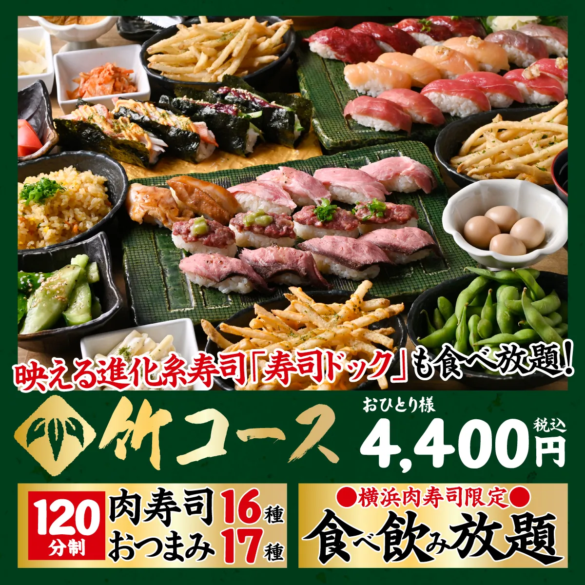 【竹コース】肉寿司16種+おつまみ17種食べ飲み放題★肉寿司と寿司ドッグで“映え宴会”♪120分4400円