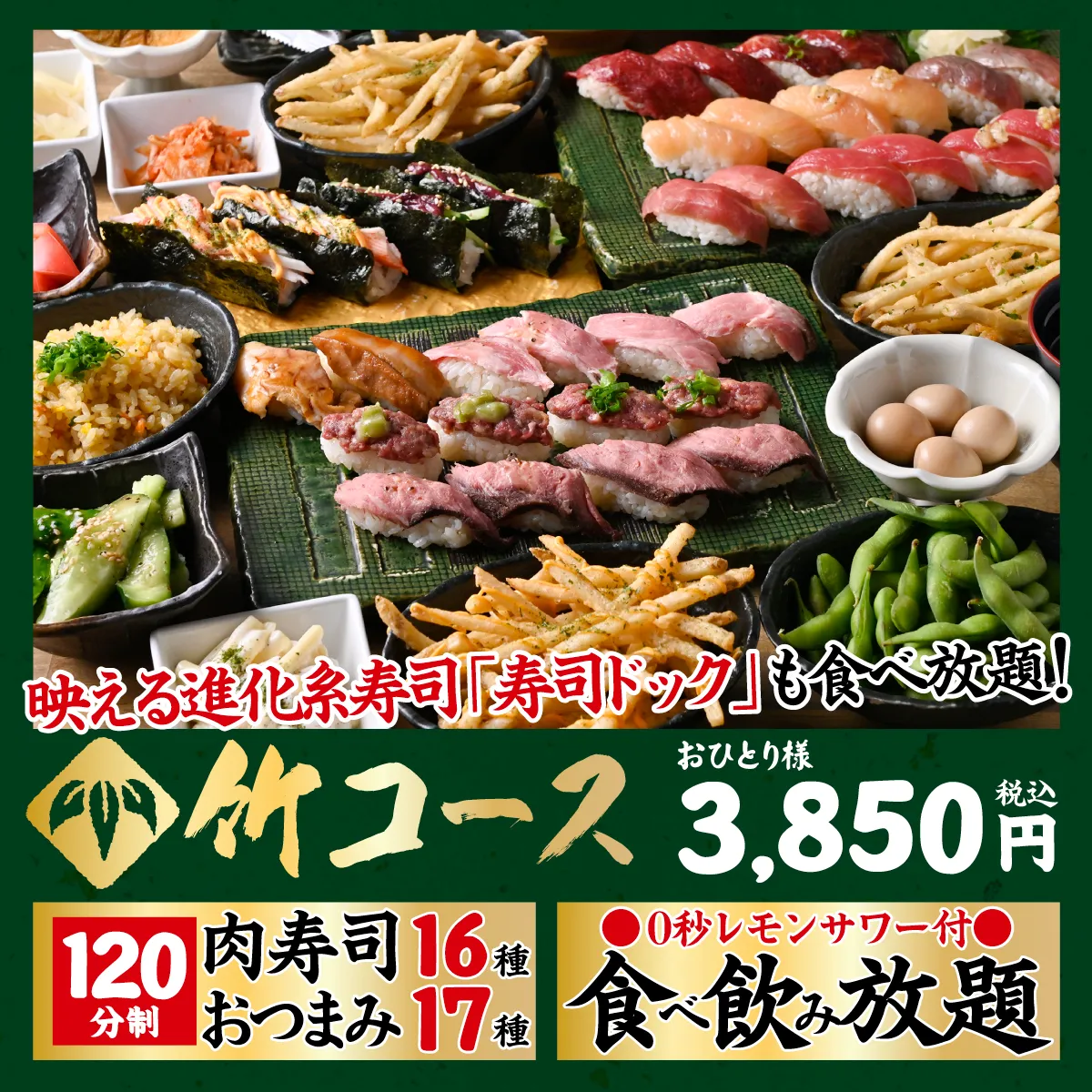 【竹コース】0秒レモンサワー付!肉寿司16種+おつまみ17種食べ飲み放題★“映え宴会”プラン♪120分3850円