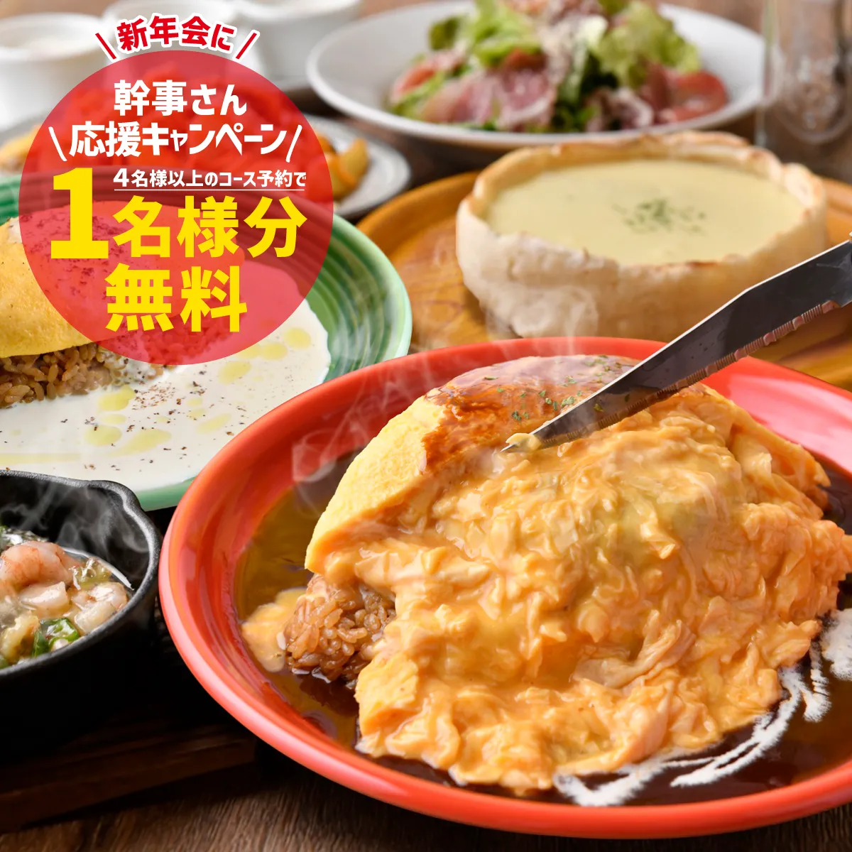 見た目も味もインパクト大!話題の「ぱっかーんオムライス」が楽しめるお手軽コース!なんと、デミグラス・明太クリーム・トリュフチーズの3種類からお好きなオムライスをお選びいただけます。さらにとろ~り自家製チーズフォンデュやチキングリル、デザートまで付いた大満足のラインナップ!