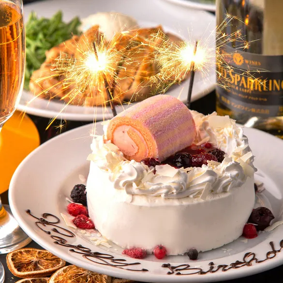 アニバーサリーにふさわしい豪華ホールケーキとシェフ渾身の絶品メニューが楽しめる特別プラン!3時間の飲み放題も付いて⇒3850円♪ホールケーキにはお名前やメッセージを無料でお書き致しますのでお気軽にご相談下さい!誕生日会・記念日・歓送迎会など様々なシーンに対応♪