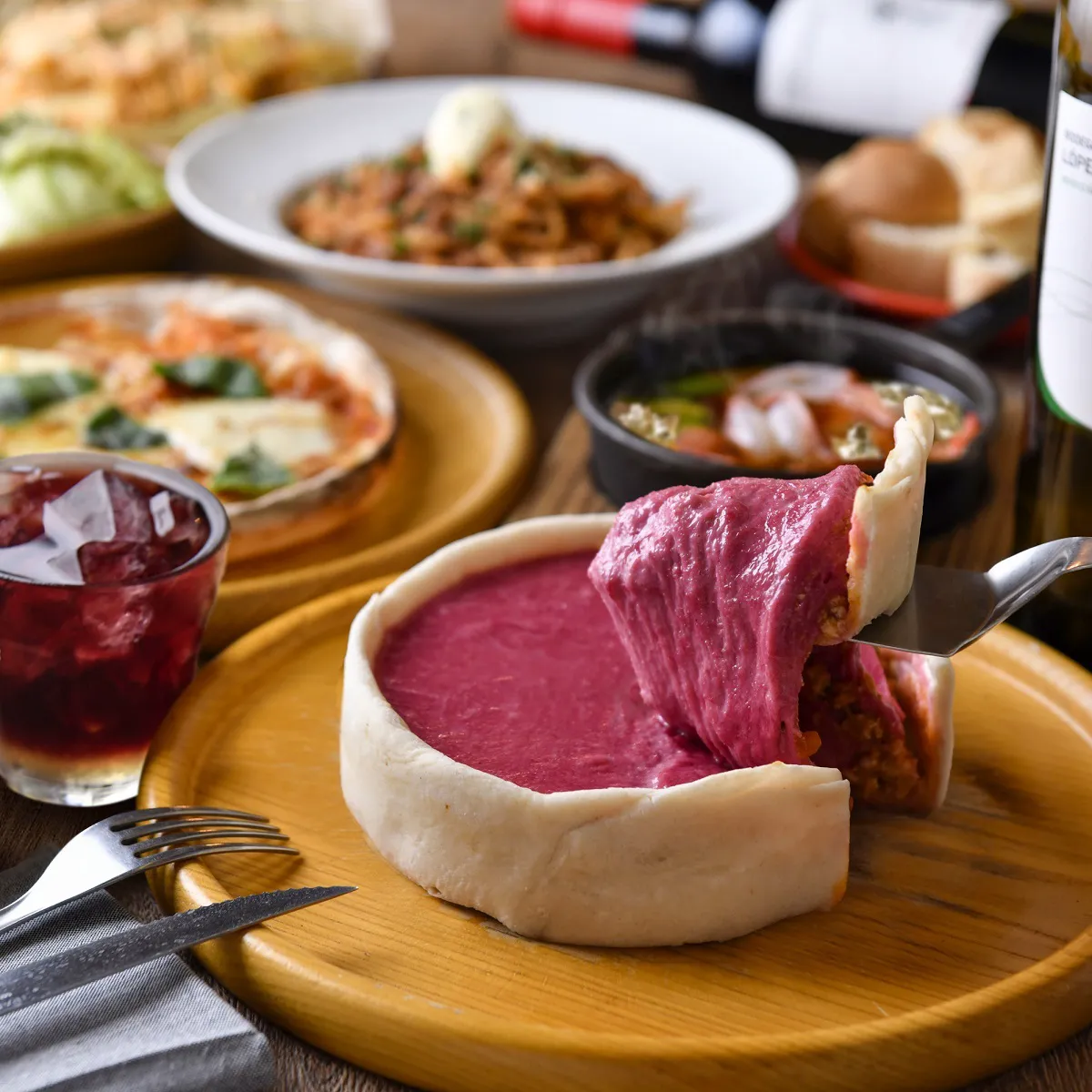 シェフこだわりの絶品イタリアンに加え、なんと当店の人気メニュー「シカゴピザ」と特製ピッツアが食べ放題に!普段とはひと味違う食べ放題を楽しみたい!そんな方におすすめです◎